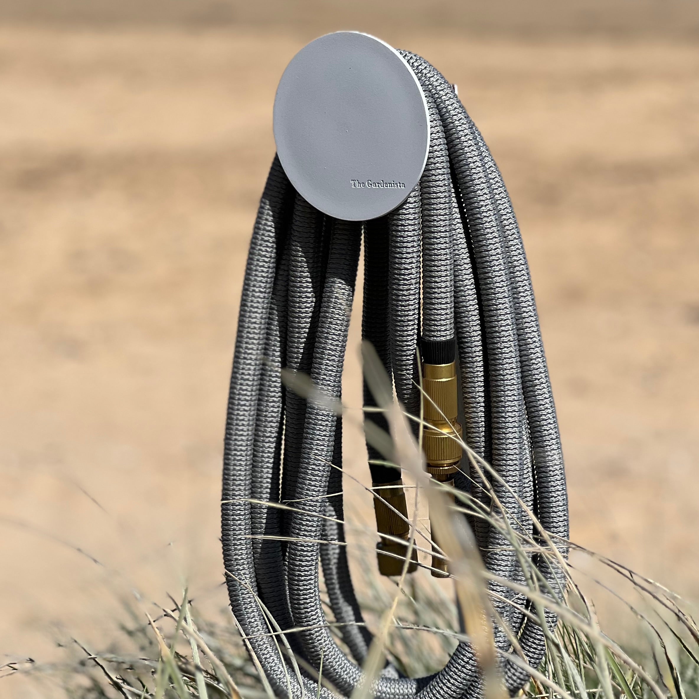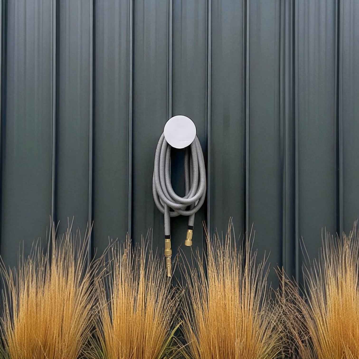 Bringing a tasteful modern expression to the traditional hose holder, these round metal discs keep your hose neat and tidy.